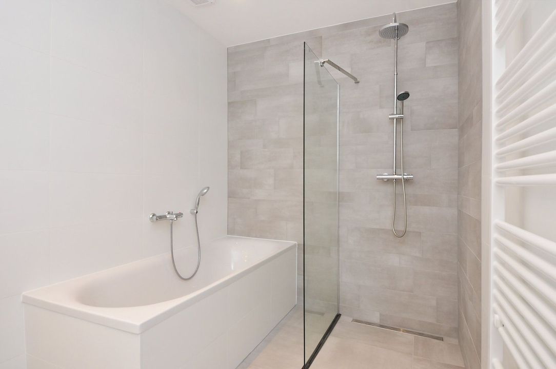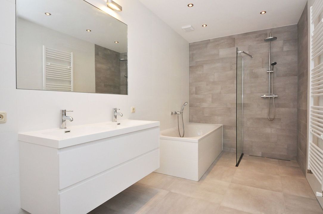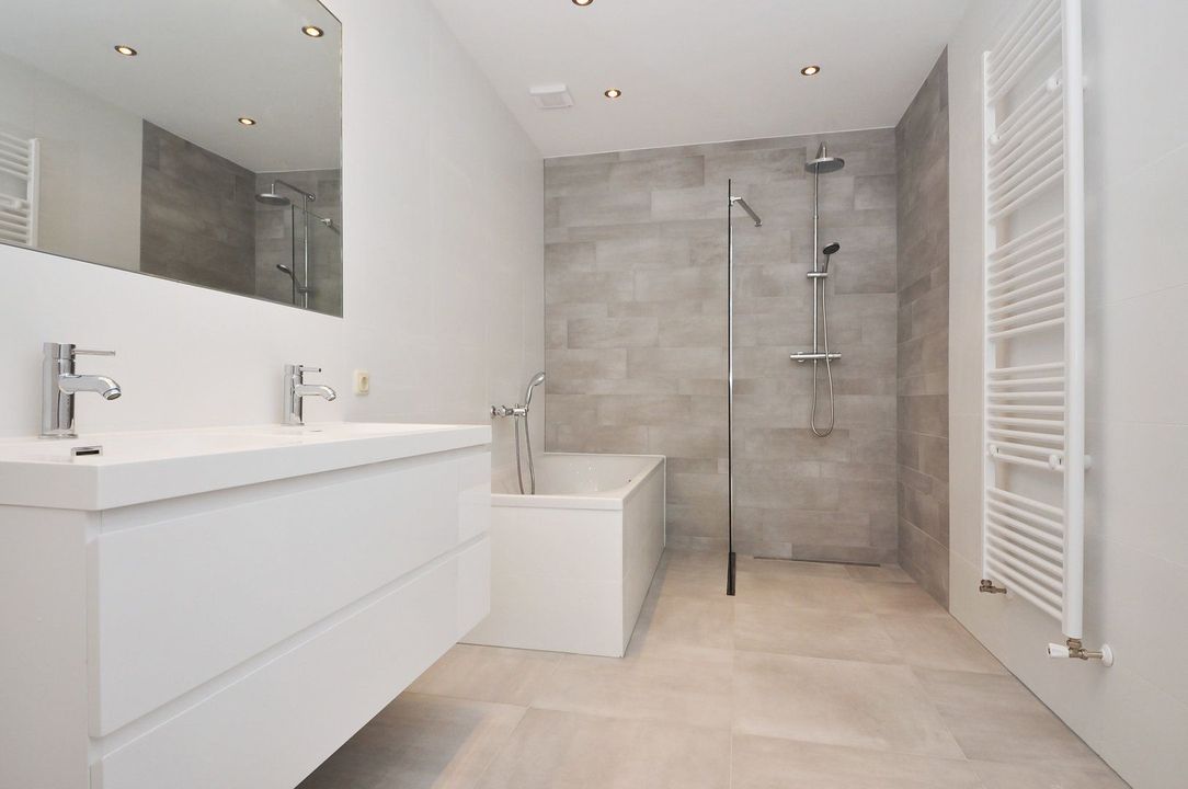 - Luxe badkamer, met ligbad, inloopdouche en dubbele wastafel, handdoeken radiator, rainshower;
